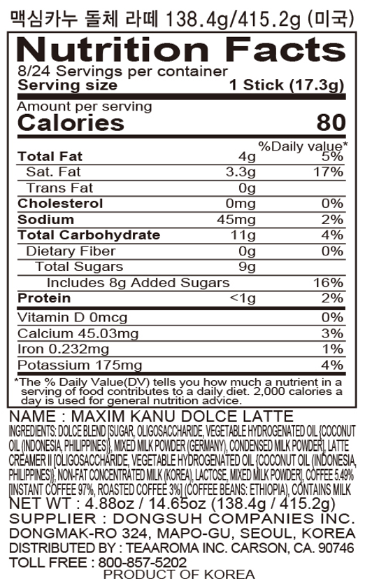 IngredientLatte Creamer[Oligosaccharide, Hydrogenated Oil, Lactose, Non-Fat Concentrated Milk, Milk Powder], Dolce Blend[Sugar, Oligosaccharide, Hydrogenated oil, Milk Powder, Condensed Milk Powder], Coffee